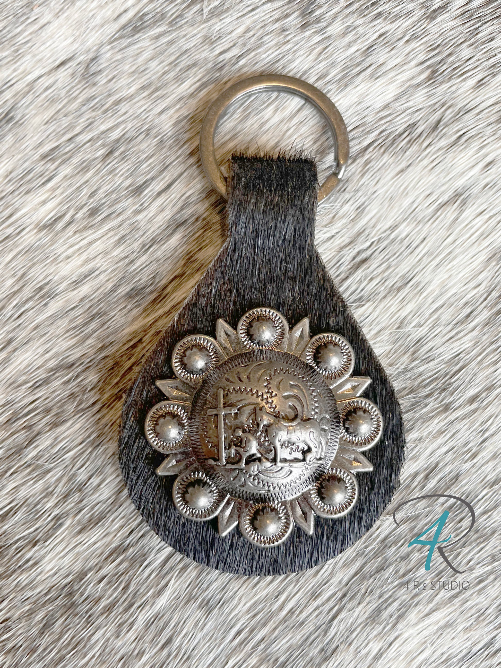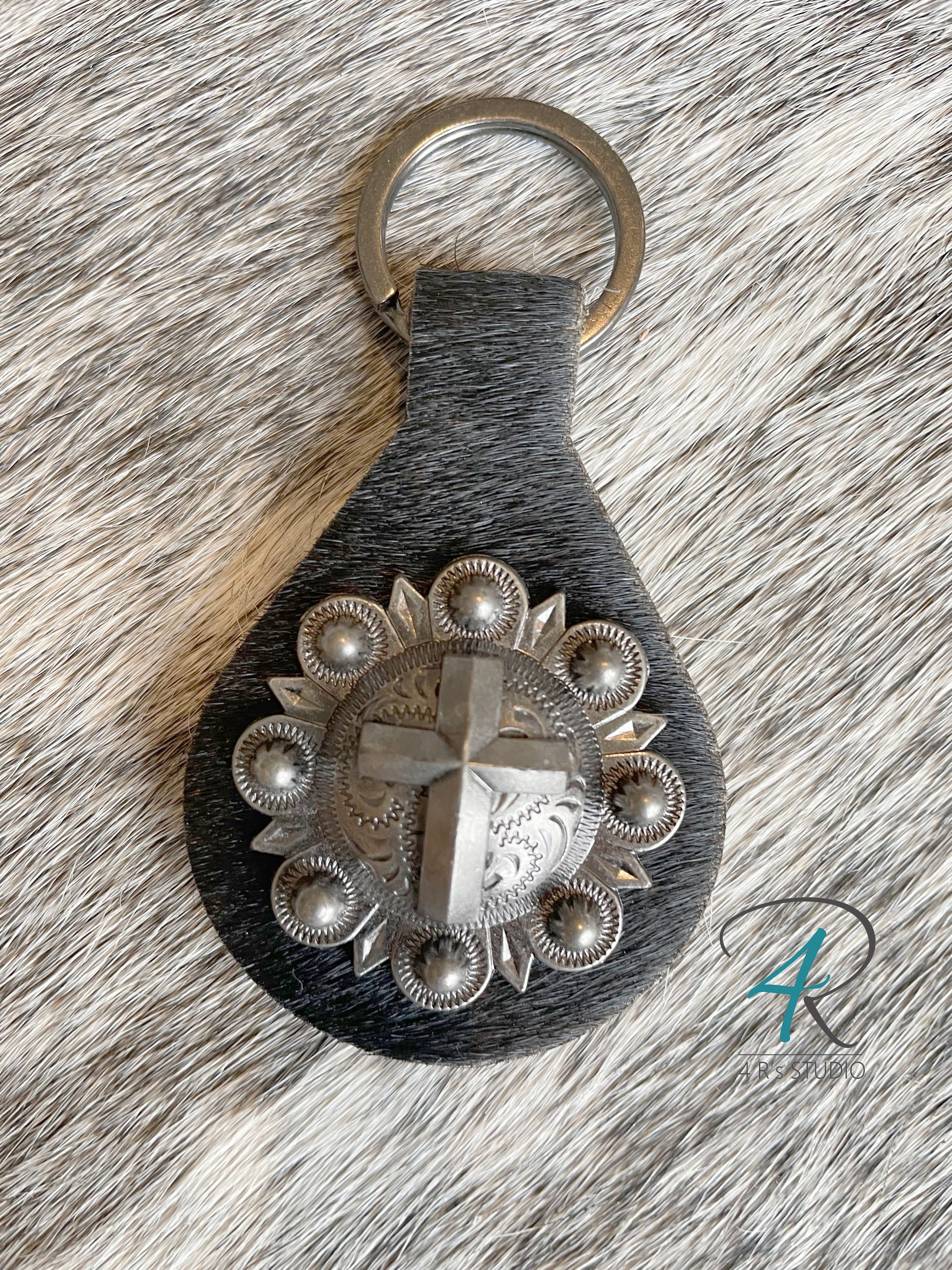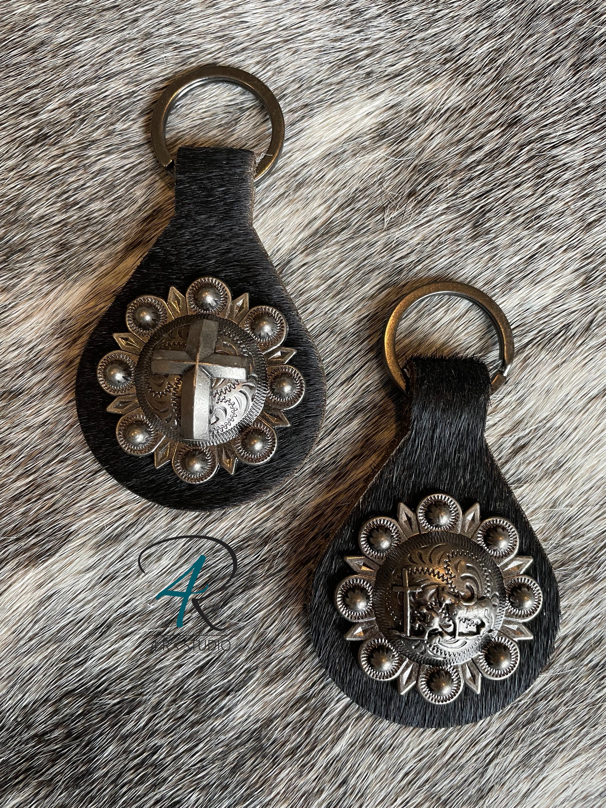 Black Cowhide Gunmetal Concho Keychains