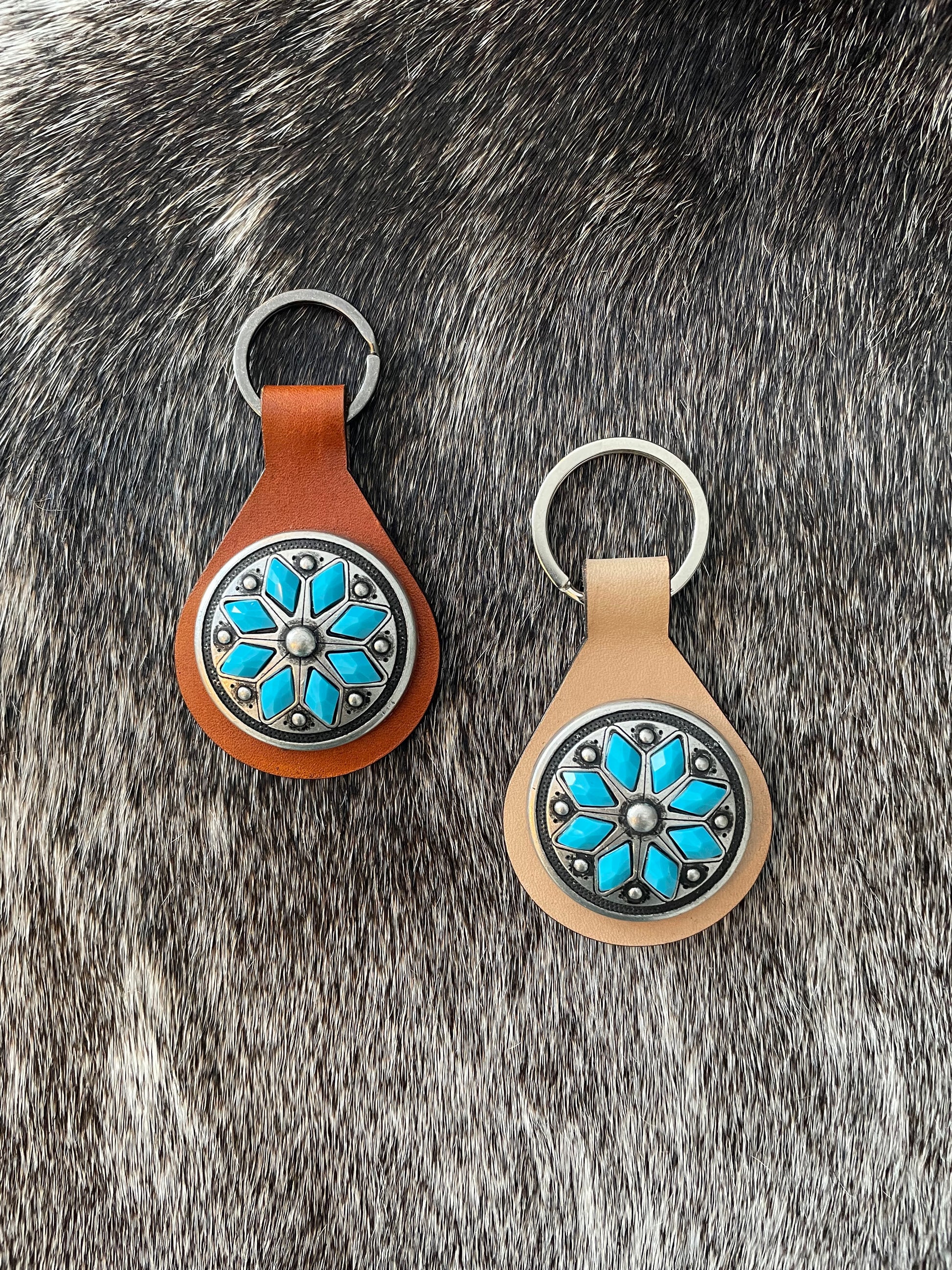 Cowhide Keychains with Turquoise Conchos