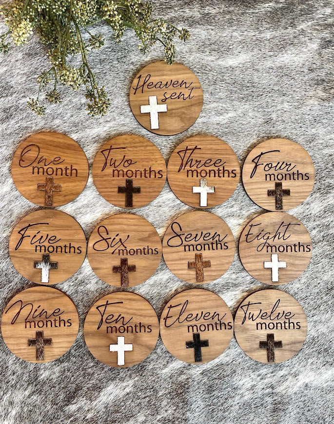 Twelve month milestones! 4" round wood engraved and cowhide crosses in each. Including a new born "Heaven Sent" round. finished with wax.